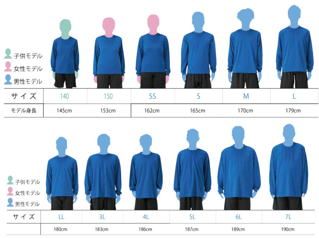 | サイズ | 140 | 150 | SS | S | M | L | LL | 3L | 4L | 5L | 6L | 7L |
