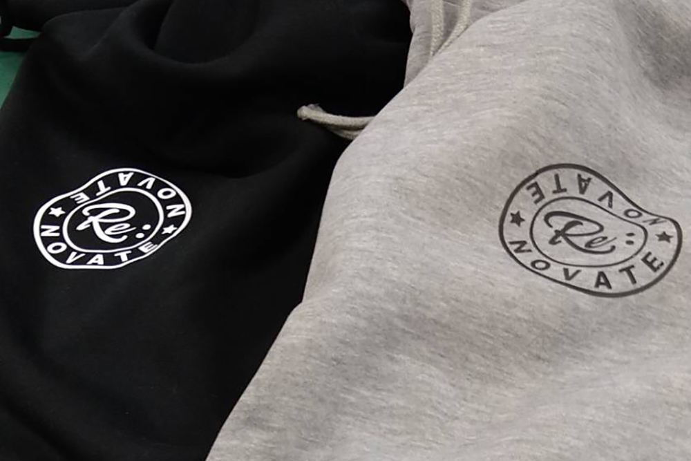 RE:NOVATE様からのご依頼で、黒とグレーのパーカーに、会社名を印刷させていただきました。