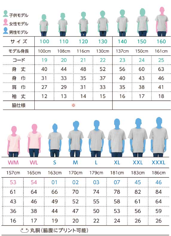 キッズサイズやレディースサイズの場合、プリント可能サイズがこちらのサイズ以下となることもございますのでご注意ください。